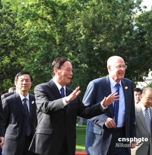 6月18日,第四次中美戰(zhàn)略經(jīng)濟(jì)對(duì)話進(jìn)入第二天。圖為中國(guó)副總理王歧山與美國(guó)財(cái)長(zhǎng)保爾森在對(duì)話開始前交談。中新社發(fā) 譚宏偉 攝