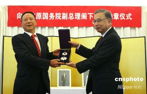 6月30日,日本授予中國前國務(wù)院副總理谷牧(本名劉家語)先生旭日大勛章。谷牧也是第二位被授予這一榮譽(yù)的中國人。圖為日本國駐華大使宮本雄二(右)向谷牧先生長子贈送勛章。谷牧先生本人因身體原因未能出席本次授勛儀式。中新社發(fā) 富田 攝