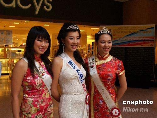 7月22日,2008年洛杉磯華埠小姐和韓國小姐亮相歡樂家庭賀中秋暨中美文化藝術(shù)節(jié)。中新社發(fā) 盧威 攝