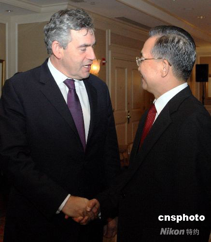 9月24日晚,中國(guó)總理溫家寶在紐約會(huì)見(jiàn)英國(guó)首相布朗。中新社發(fā) 李靜 攝