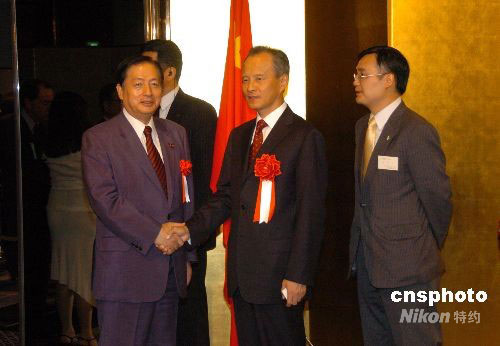 9月26日晚,中國駐日大使崔天凱在東京舉行盛大的國慶招待會,與日本各界人士、在日華僑華人代表共慶中華人民共和國成立五十九周年,一千五百余人應(yīng)邀出席。圖為日本執(zhí)政黨之一的公明黨黨首太田昭宏(左)出席招待會時與崔天凱大使交流。中新社發(fā) 段躍中 攝
