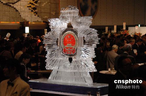 9月26日晚,中國駐日大使崔天凱在東京新大谷飯店舉行盛大的國慶招待會,與日本各界人士、在日華僑華人代表共慶中華人民共和國成立五十九周年,一千五百余人應邀出席。會場入口處,一座大型中國國徽冰雕引人注目。據介紹,這是新大谷飯店為祝賀中國國慶特別制作的。中新社發(fā) 段躍中 攝