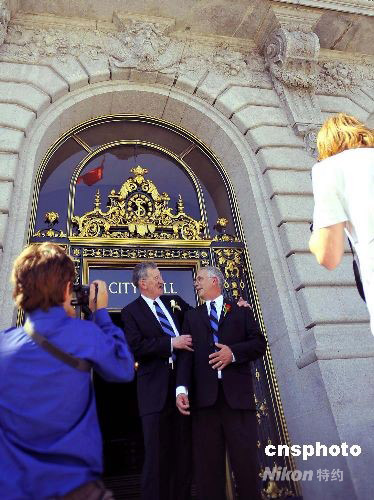 九月二十九日是美國舊金山同性戀伴侶麥卡弗和德斯勒相愛三十年的日子。三十年前的今天,他們在香港度蜜月。三十年后他們在舊金山市政府領取了結(jié)婚證書。加州最高法院裁定二00八年六月十六日是同性戀婚姻合法化的日子,但加州選民將在十一月再次對同性戀婚姻進行投票表決。中新社發(fā) 陳鋼 攝