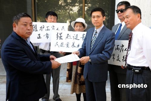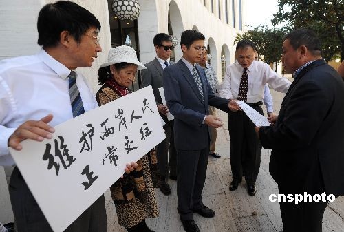 當(dāng)?shù)貢r間十月二十二日,南加州中國和平統(tǒng)一促進(jìn)會聯(lián)盟主席周德昭將一封抗議信交付“駐洛杉磯臺北經(jīng)濟(jì)文化辦事處”代表楊光彬。這份由當(dāng)?shù)囟鄠華人社團(tuán)聯(lián)名的抗議信稱,大陸海協(xié)會副會長張銘清在臺南遭民進(jìn)黨極端分子暴力攻擊事件震驚海外華人社會,華人社團(tuán)嚴(yán)厲譴責(zé)極端分子的野蠻暴力行徑,強(qiáng)烈要求馬英九政府嚴(yán)懲肇事者。中新社發(fā) 張煒 攝