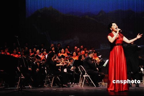 華盛頓黃河藝術(shù)團(tuán)藝術(shù)家在當(dāng)?shù)貢r(shí)間十月二十五日晚的演出中用中國(guó)改革開放歷程中涌現(xiàn)的歌曲,抒發(fā)中國(guó)人共同經(jīng)歷的改革開放不平凡的三十年,引起了海外華人強(qiáng)烈共鳴。圖為黃河藝術(shù)團(tuán)藝術(shù)家演唱《好一個(gè)中國(guó)大舞臺(tái)》贏得雷鳴掌聲。中新社發(fā) 邱江波 攝