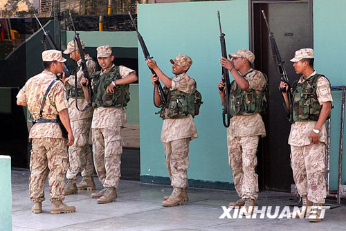 11月16日,在秘魯首都利馬的亞太經(jīng)合組織(APEC)領(lǐng)導(dǎo)人非正式會議國際新聞中心,執(zhí)勤士兵檢查槍械。秘魯軍方日前在利馬部署了近一萬名士兵,以確保將于11月22日至23日舉行的APEC第十六次領(lǐng)導(dǎo)人非正式會議安全舉行。
