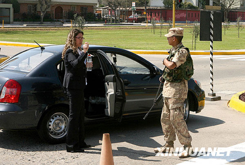 11月16日,在秘魯首都利馬的亞太經(jīng)合組織(APEC)領(lǐng)導(dǎo)人非正式會議國際新聞中心,執(zhí)勤士兵檢查車輛。新華社記者 張傳奇 攝