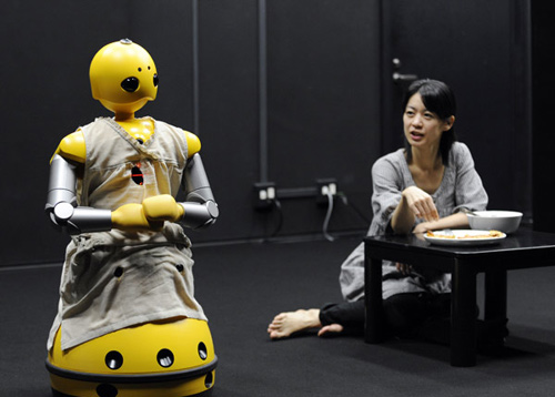 11月25日,在日本大阪大學(xué),一個(gè)取名為若丸的機(jī)器人與一名女演員同臺(tái)表演。當(dāng)天,這臺(tái)時(shí)長(zhǎng)為20分鐘的演出由機(jī)器人與演員共同完成,該劇有可能于明年公演。