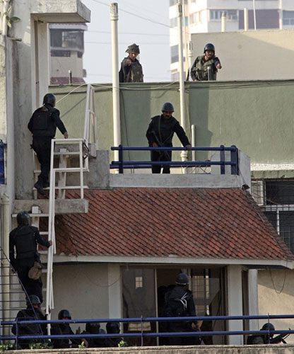 11月28日,在印度孟買,印度突擊隊員從武裝直升機(jī)上空降到納里曼大樓的樓頂。印度警方證實,印度軍警已經(jīng)從孟買市內(nèi)猶太人聚居的納里曼大樓中解救出7名人質(zhì),其中包括2名外國人,但目前還有多名人質(zhì)在武裝分子手中。