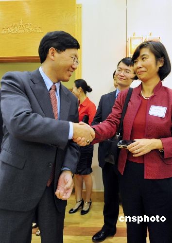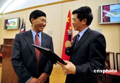 當(dāng)?shù)貢r(shí)間十二月五日,中國駐舊金山總領(lǐng)事高占生向美國加州大學(xué)戴維斯分校華裔教授潘忠禮(左)頒發(fā)賀狀,祝賀他獲得2007年度美國青年科學(xué)家總統(tǒng)獎(jiǎng)。今年春天,潘忠禮教授曾獲得美國農(nóng)業(yè)部2007年度赫爾伯特-拉波爾特杰出中青年農(nóng)業(yè)研究科學(xué)家獎(jiǎng)。中新社發(fā) 陳鋼 攝