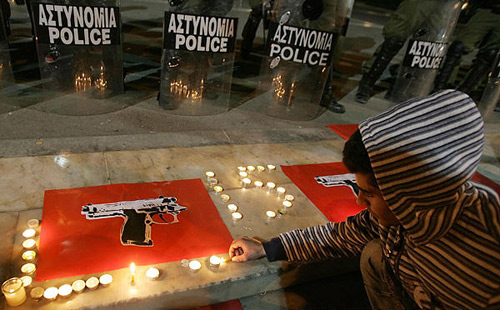 一名青年點(diǎn)燃蠟燭,悼念被警察打死的15歲少年格里戈羅普洛斯。