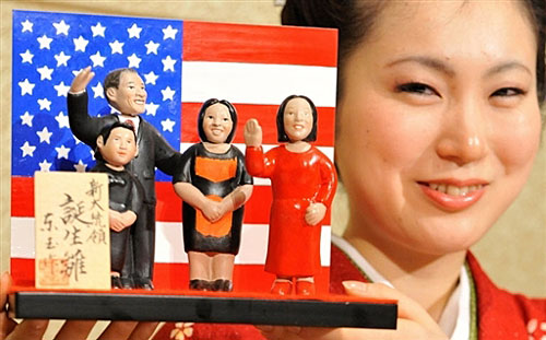 2008年12月11日,在日本東京全日空洲際酒店,日本傳統(tǒng)玩偶制造商Togyoku推出2008年度新聞娃娃(kawaribina),藉此以反應這一年來全球所發(fā)生的新聞事件。這批玩偶包括奧巴馬全家慶祝當選美國總統(tǒng)的玩偶和獲得2008年諾貝爾獎的日本科學家玩偶。