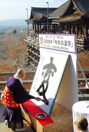 據(jù)日本共同社報道,日本漢字能力檢定協(xié)會12日在京都清水寺宣布,“變”字被選為最能象征2008年世態(tài)的漢字。征集活動中共收到111208件投稿,其中6031件選擇了“變”,所占比例為5.4%。選擇“變”的理由包括日本首相短期內(nèi)換人、提倡“變革”的奧巴馬當選美國下任總統(tǒng)、全球金融形勢動蕩不安等!敖稹焙汀奥洹狈至卸。