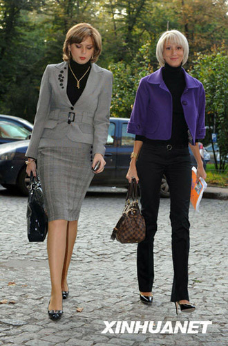 這是2008年9月29日,羅伯塔·阿納斯塔塞(左)與同事一起前往布加勒斯特的民主自由黨總部開會的資料照片。