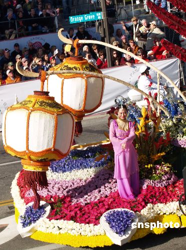 當(dāng)?shù)貢r間1月1日,第120屆美國帕薩迪娜玫瑰花車游行拉開2009新年序幕。游行隊伍由90個方陣組成,包括46輛花車、22支軍樂隊、18支騎術(shù)隊和5輛禮賓車,美輪美奐,精彩紛呈。臺灣中華航空公司的玫瑰花車“火鳳凰”,在花車游行中勇奪國際大獎。該花車名為“臺灣燈會”,花車上凸顯中國燈籠和“仙女下凡”,奪人眼球。中新社發(fā) 盧威 攝