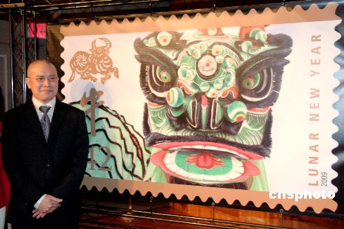 美國(guó)郵政總局8日正式發(fā)行“牛年”郵票,以慶祝世界約四分之一人口正期盼的農(nóng)歷新年“牛年”到來(lái)。圖為郵票設(shè)計(jì)者、現(xiàn)居紐約的華裔郵票藝術(shù)家麥錦鴻(Kam Mak)和“牛年”郵票。中新社發(fā) 魏晞 攝