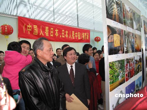 2009年1月28日,中國駐日本大使崔天凱和在此歡度春節(jié)的一百多名中國留學(xué)生觀看了“中國人看日本,日本人看中國”。該攝影展由全日本中國留學(xué)人員友好聯(lián)誼會主辦,春節(jié)期間在日本富士山畔的富士急Highland藝術(shù)廳舉行。中新社發(fā) 段躍中 攝