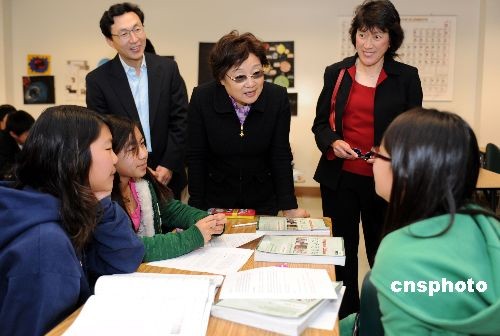 當?shù)貢r間二月八日,中國國務(wù)院僑辦主任李海峰(中)來到美國加州圣地亞哥華夏中文學校參觀訪問,并與學生進行面對面交流,了解他們的家庭語言環(huán)境和中文學習進展。據(jù)了解,從今年開始,國僑辦將在海外遴選一批“華文教育示范學!,并在教材、師資等方面提供幫助與扶持。中新社發(fā) 張煒 攝