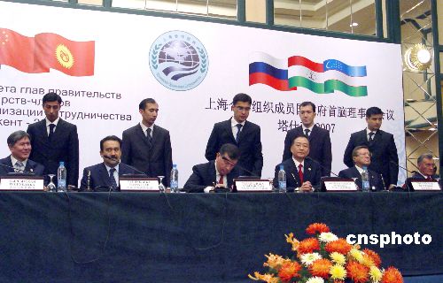 十一月二日,在烏茲別克斯坦首都塔什干舉行的上海合作組織總理第六次會(huì)議結(jié)束后,六國總理簽署了聯(lián)合公報(bào)等文件,并共同會(huì)見了記者。中新社發(fā) 孫宇挺 攝