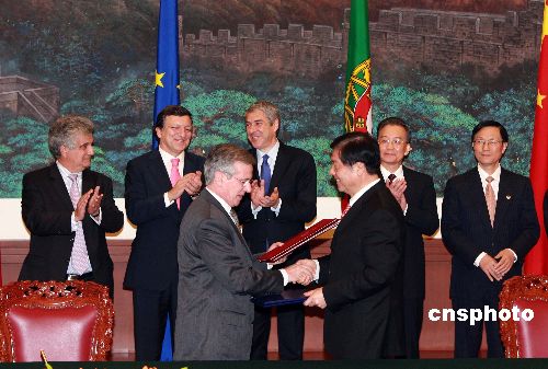 十一月二十八日,北京人民大會(huì)堂,中國國務(wù)院總理溫家寶會(huì)見歐盟輪值主席國葡萄牙總理索克拉特斯(后左三)與歐盟委員會(huì)主席巴羅佐(后左二),并在會(huì)見后共同出席中國與歐盟三項(xiàng)合作文本的簽字儀式。中新社發(fā) 廖文靜 攝