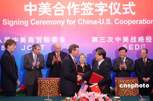 十二月十一日,中美雙方在北京釣魚臺(tái)國(guó)賓館舉行中美合作簽字儀式,中國(guó)國(guó)務(wù)院副總理吳儀、美國(guó)財(cái)政部長(zhǎng)鮑爾森、商務(wù)部長(zhǎng)古鐵雷斯等出席簽字儀式。中新社發(fā) 毛建軍 攝