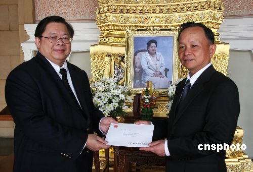 一月三日,中國國家主席胡錦濤向泰國國王普密蓬發(fā)來唁電,對泰國王姐甘拉亞妮·瓦塔娜逝世表示哀悼。當日上午,中國駐泰大使張九桓(右)通過泰國外交部轉交這份唁電。中新社發(fā) 顧時宏 攝