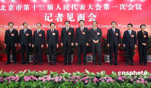1月26日,北京市第十三屆人大一次會議閉幕,新當選的北京市市長郭金龍率全體副市長集體亮相。從左至右分別為:陳剛、趙鳳桐、牛有成、蔡赴朝、郭金龍、吉林、劉敬民、陸昊、丁向陽、程紅。中新社發(fā) 張宇 攝