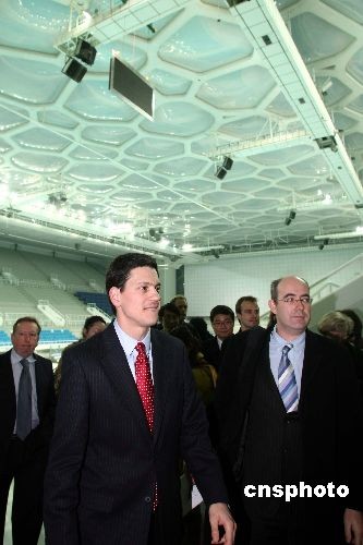 圖:英國(guó)外交大臣米利班德參觀中國(guó)國(guó)家游泳中心