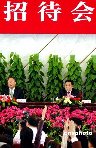 3月11日,十一屆全國人大一次會議新聞發(fā)布會在北京人民大會堂舉行。國家發(fā)展和改革委員會副主任解振華(左)、國家環(huán)境保護總局副局長張力軍,就環(huán)境資源、節(jié)能減排、2008奧運期間北京空氣質量等問題回答記者提問。中新社發(fā) 王東明 攝