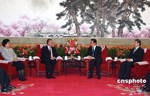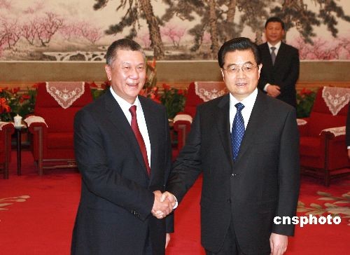 3月18日,中國國家主席胡錦濤在北京中南海會見了來京列席十一屆全國人民代表大會一次會議的澳門特別行政區(qū)行政長官何厚鏵。中新社發(fā) 廖文靜 攝