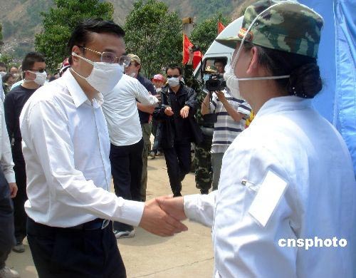 5月19日下午,中共中央政治局常委、國(guó)務(wù)院副總理李克強(qiáng)來(lái)到北川縣城救災(zāi)現(xiàn)場(chǎng),視察指導(dǎo)現(xiàn)場(chǎng)救援工作,李克強(qiáng)在察看了北川縣受災(zāi)全貌后,慰問(wèn)了在重慶消防總隊(duì)醫(yī)院在北川縣城救援點(diǎn)設(shè)置的急救帳篷里工作的官兵。中新社發(fā) 陳誠(chéng) 攝