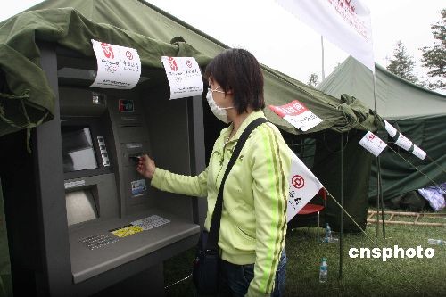 圖為設(shè)在四川都江堰災區(qū)的帳篷ATM機。