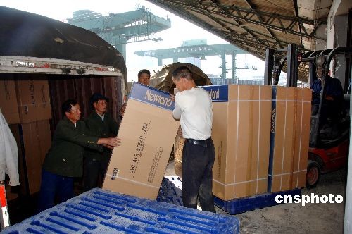 五月二十一日,福州市民政局工作人員在福州鐵路貨運(yùn)東站裝運(yùn)發(fā)送災(zāi)區(qū)急需的紫外線空氣清新機(jī)。經(jīng)過(guò)跟蹤汶川地震救災(zāi)工作需求,福州向社會(huì)各界發(fā)布捐助信息,至二十日十六時(shí)收到各界人士捐獻(xiàn)的紫外線空氣清新機(jī)、小型輪式消毒車、接骨板、嬰兒奶粉、衣被等急需物品價(jià)值約一千三百萬(wàn)元人民幣。