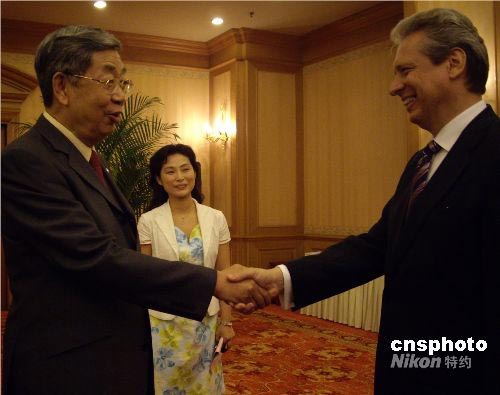 7月8日晚,當羅馬尼亞駐華大使伊斯蒂奇瓦亞(右)用一口流利的中文與十屆全國人大常委會副委員長許嘉璐(左)進行著一次關于全球化背景下語言作用的深刻對話時,漢語無疑搭建了一座溝通中國與世界心靈與思想的橋梁。 包括伊斯蒂奇瓦亞及秘魯、保加利亞、孟加拉、印尼等國的駐華使節(jié),隨55個國家的100多名大學生漢語愛好者一道來到湖南長沙,這些學生將參加第七屆“漢語橋”世界大學生中文比賽。當晚,許嘉璐在長沙會見了駐華使節(jié)一行。中新社發(fā) 傅煜 攝