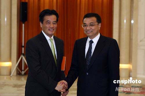 7月16日,中共中央政治局常委、國務(wù)院副總理李克強在北京人民大會堂會見日本民主黨副黨首岡田克也。中新社發(fā) 盛佳鵬 攝