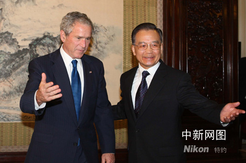 8月10日,中國國務(wù)院總理溫家寶在北京中南海會(huì)見美國總統(tǒng)布什一行。中新社記者 廖文靜攝