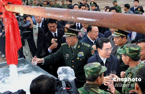 9月24日,寧夏回族自治區(qū)成立50周年慶祝活動中央代表團(tuán)團(tuán)長賀國強(qiáng)率一分團(tuán)到固原市慰問,在寧夏軍區(qū)給水團(tuán)正在打井的工地,賀國強(qiáng)拿起水杯同在場的民眾共同暢飲剛剛出井的“幸福水”。為幫助解決寧南山區(qū)和中部干旱帶用水困難,寧夏軍區(qū)組織給水團(tuán)實施新一輪“百井支農(nóng)富民”工程,初步解決近5萬人用水問題。中新社發(fā) 廖攀 攝