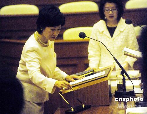 十月八日,香港新一屆立法會舉行首次會議,議員逐一宣誓就職。圖為葉劉淑儀宣誓。中新社發(fā) 譚達明 攝