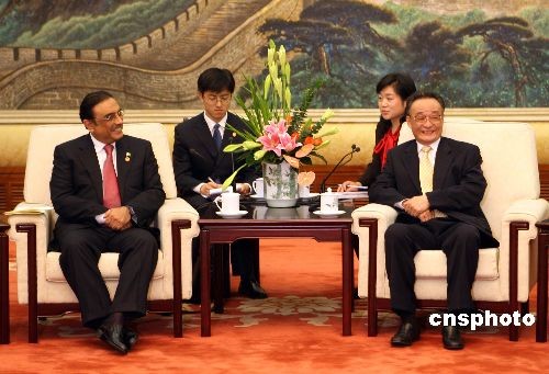 十月十六日,全國(guó)人大常委會(huì)委員長(zhǎng)吳邦國(guó)在北京人民大會(huì)堂會(huì)見(jiàn)巴基斯坦總統(tǒng)扎爾達(dá)里一行。中新社發(fā) 任海霞 攝
