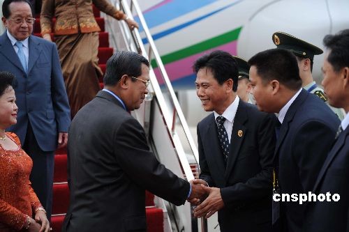 十月二十日中午,柬埔寨首相洪森飛抵廣西南寧,出席將于二十二日開幕的第五屆中國—東盟博覽會。這是他第五次出席中國—東盟博覽會,在廣西南寧國際機(jī)場,受到廣西官員的熱烈歡迎。中新社發(fā) 蔣雪林 攝
