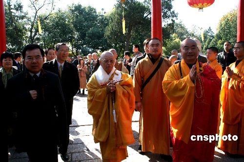 11月11日,日本奈良市長藤原昭、唐招提寺長老松浦俊海率友好代表團一行,在揚州市領導陪同下拜訪揚州大明寺并舉行鑒真大和尚追思會。大明寺能修大師率兩序大眾在山門親自迎接,并舉行了隆重的歡迎儀式。中新社發(fā) 崔佳明 攝