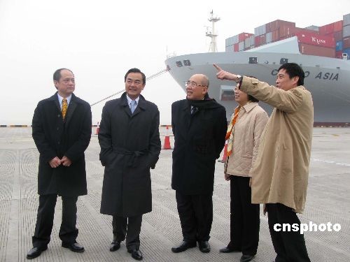 12月20日下午,中共中央臺(tái)辦主任王毅陪同中國(guó)國(guó)民黨主席吳伯雄一行前往上海洋山深水港參觀(guān)。中新社發(fā) 張子揚(yáng) 攝