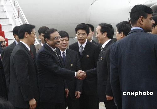 2月22日中午,在湖北進(jìn)行友好訪問的巴基斯坦總統(tǒng)扎爾達(dá)里乘機(jī)抵達(dá)湖北宜昌市。在宜昌市期間,扎爾達(dá)里將與中國(guó)三峽總公司舉行項(xiàng)目會(huì)談,并參觀三峽工程紀(jì)念館和三峽大壩等。圖文扎爾達(dá)里總統(tǒng)與宜昌市長(zhǎng)李樂成握手。中新社發(fā) 艾啟平 攝