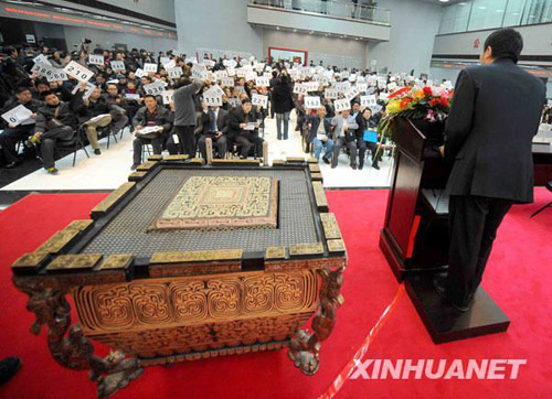3月8日,“2008北京第29屆奧運(yùn)會開幕式演出道具‘缶’專場拍賣會”在北京產(chǎn)權(quán)交易所落槌。首個標(biāo)的共十個缶以1.3萬元總價起拍,經(jīng)過近百輪激烈競價,最終以70.6萬元被347號買家競得。據(jù)介紹,當(dāng)日有1000只缶約53個標(biāo)的投入競拍,共有439家單位和個人報名參與了現(xiàn)場競買,52名競買人以5244.7萬元的總價拍走1000個奧運(yùn)缶,單個均價約5.2萬元,較0.11萬元的單個起拍均價而言,身價大增46倍。此次拍賣會創(chuàng)造了奧運(yùn)物資拍賣歷史上拍賣持續(xù)時間最長、競買人最多、競價輪次最多、溢價率最高4個紀(jì)錄。