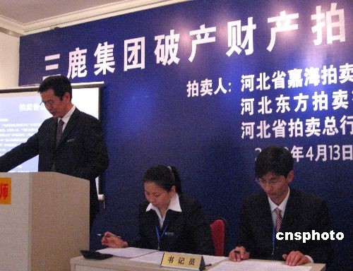 4月13日,由河北省嘉海拍賣有限公司作為主拍單位,與河北省東方拍賣有限公司、河北省拍賣總行有限公司共同進(jìn)行拍賣三鹿集團(tuán)部分資產(chǎn)。當(dāng)日拍賣的11項(xiàng)破產(chǎn)財產(chǎn),競買人顯然無意出手,其中天津三鹿乳業(yè)51%的股權(quán)竟叫出20萬元的起拍價,最終也無人問津,三鹿集團(tuán)第4批破產(chǎn)財產(chǎn)全部流拍。中新社發(fā) 翟羽佳 攝