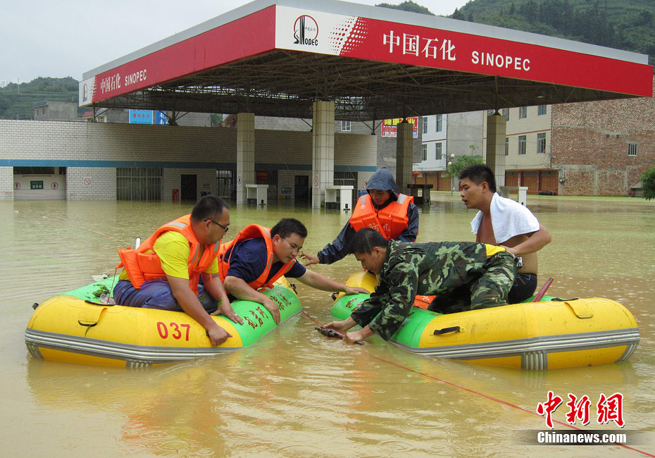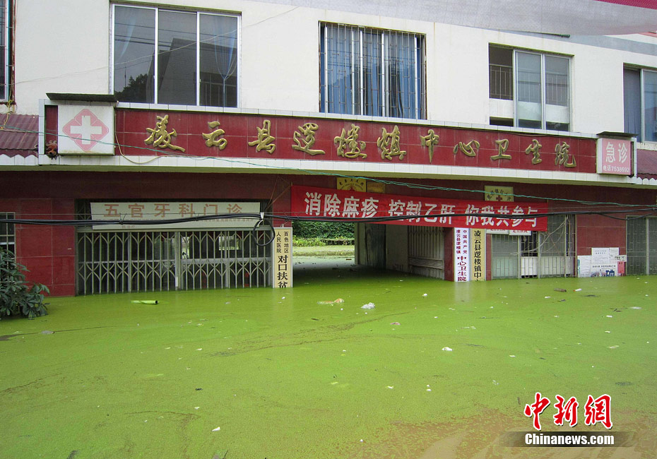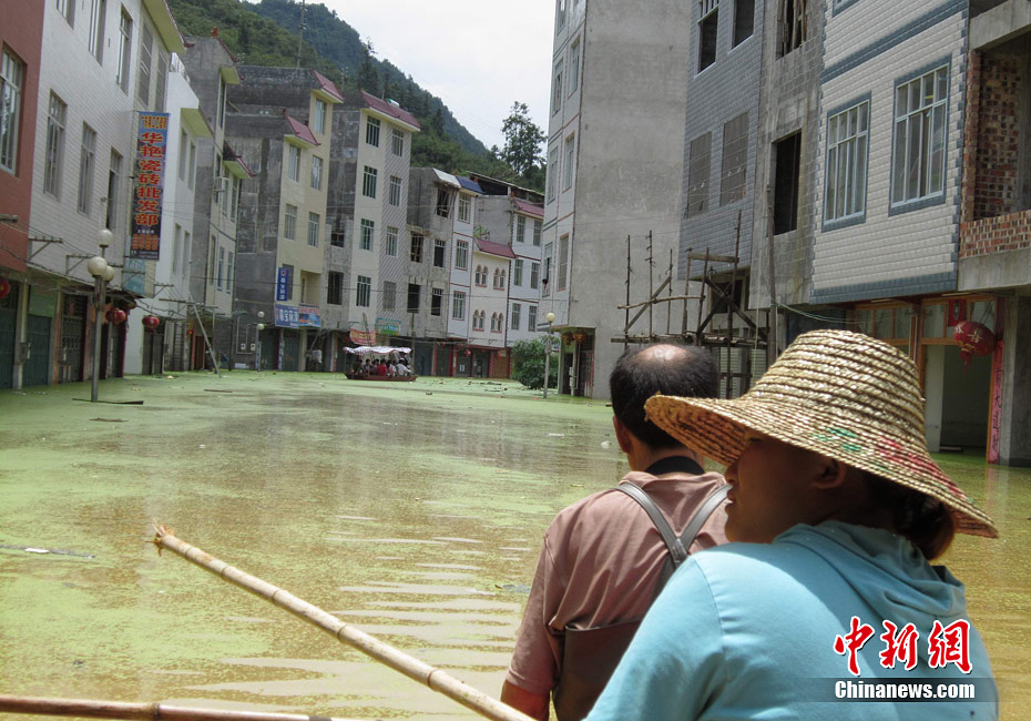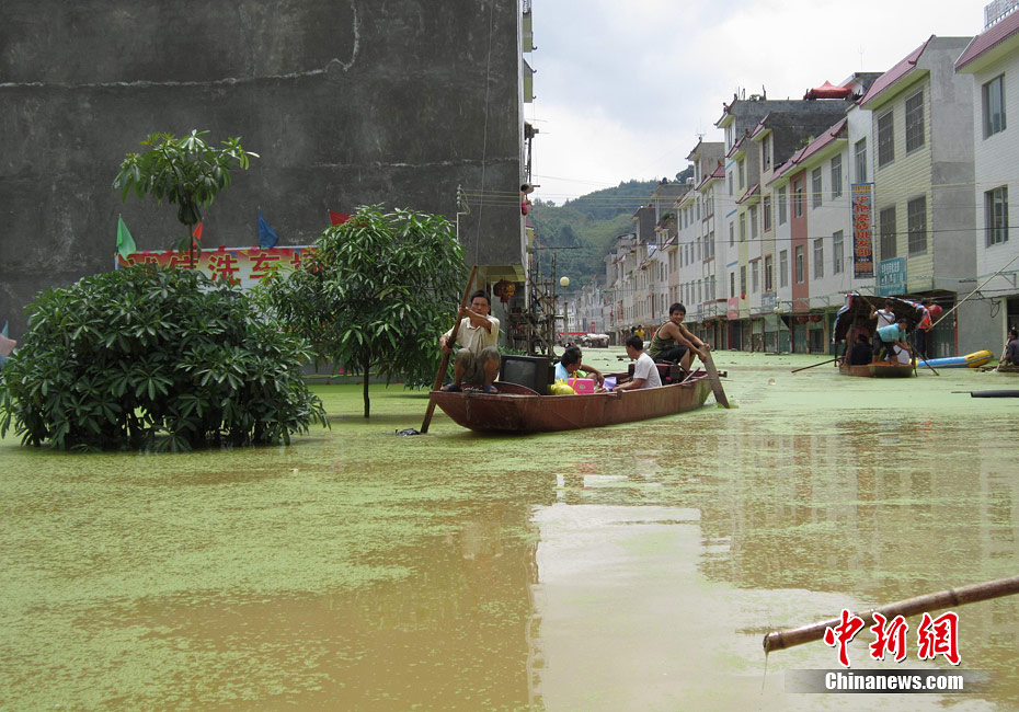 由于遭遇連日暴雨,廣西凌云縣邏樓鎮(zhèn)內(nèi)澇成災(zāi),全鎮(zhèn)一片汪洋,積水深達(dá)2米多高,民眾只能用小機(jī)船和自制排伐作為交通工具。由于該鎮(zhèn)所在地為一個小盤地,沒有排水的地方,估計一個月后積水才能自然排完。6月27日20時至29日,廣西凌云縣遭遇罕見強(qiáng)降雨襲擊,造成嚴(yán)重洪澇災(zāi)害。初步統(tǒng)計,當(dāng)?shù)匾丫o急轉(zhuǎn)移一萬多人。圖為30日所攝邏樓鎮(zhèn)被淹景象。黃燕飛 攝
