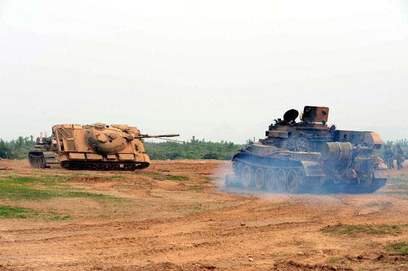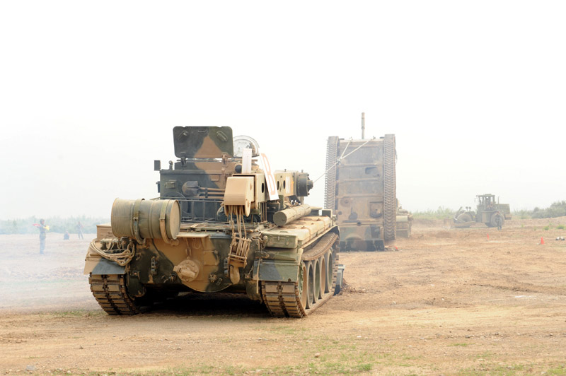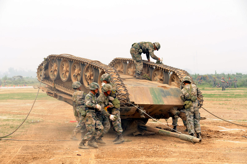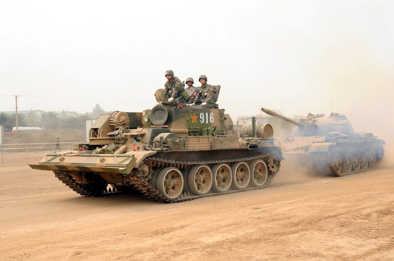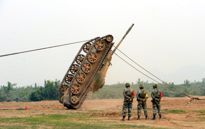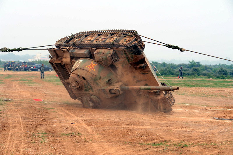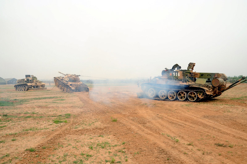 6月29日,北京軍區(qū)基礎(chǔ)比武進入第二天,裝甲搶救車牽引訓練坦克駛?cè)氡任洮F(xiàn)場。圖片來源:新華網(wǎng) 高航 攝