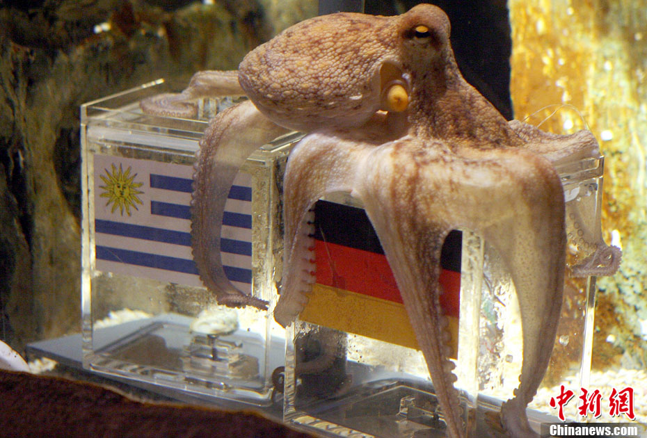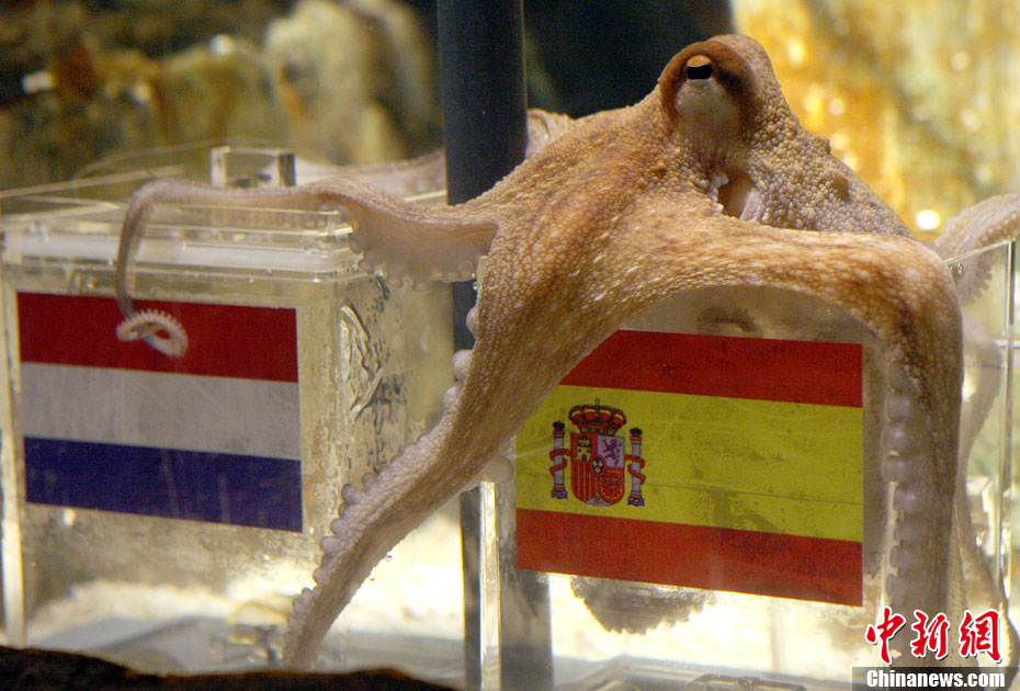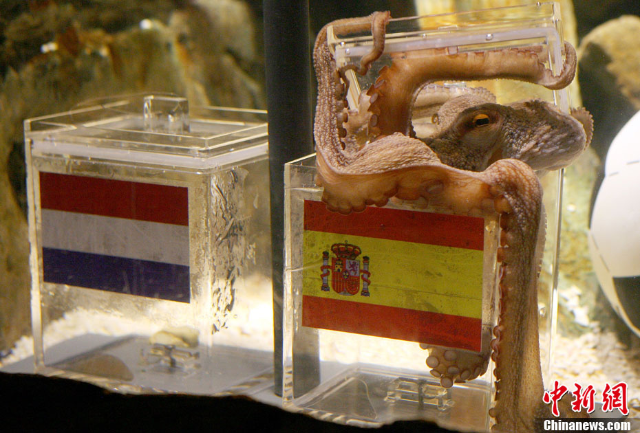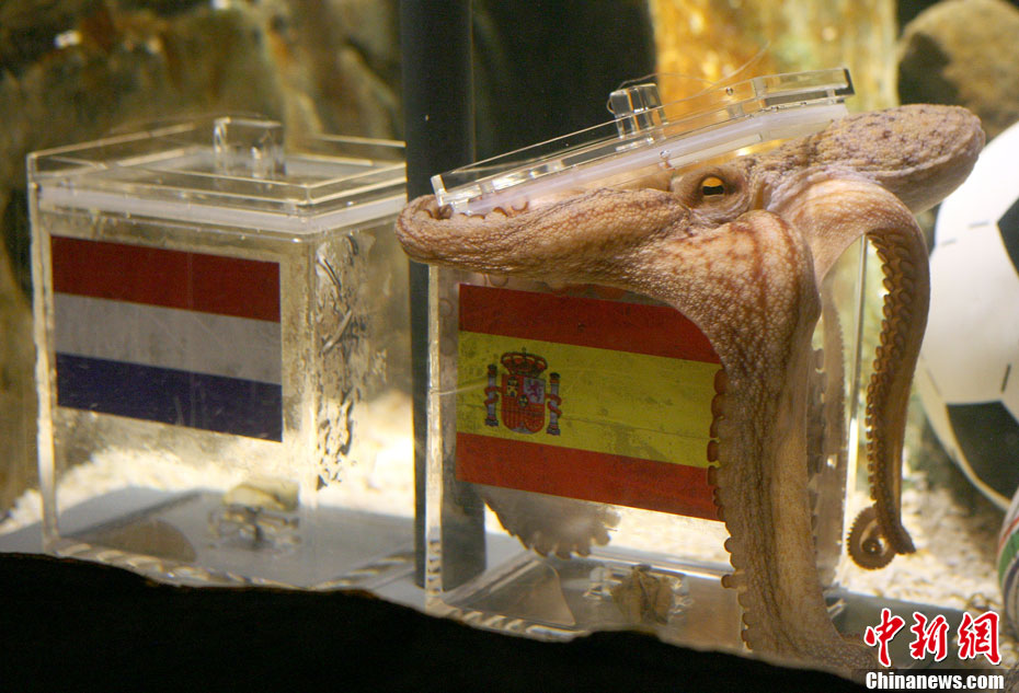 7月9日,神奇章魚保羅對周日凌晨即將進行的世界杯決賽順利進行了預測,預測結果是西班牙將會戰(zhàn)勝荷蘭,勇奪世界杯。擁有驕人預測成績的保羅在做決定的時候也毫不含糊,在面對印有西班牙國旗和荷蘭國旗的兩個水槽中,它不假思索直接選擇了歐洲冠軍西班牙,而德國隊將奪得南非世界杯季軍。
