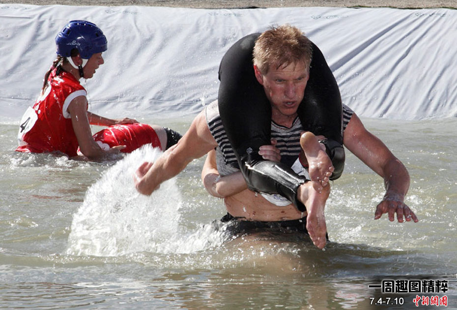 一年的一度的世界背老婆大賽在芬蘭中部小鎮(zhèn)松卡耶爾維舉行,參賽者背著自己的老婆在泳池里行走,最終來自芬蘭的一對選手最先通過終點。