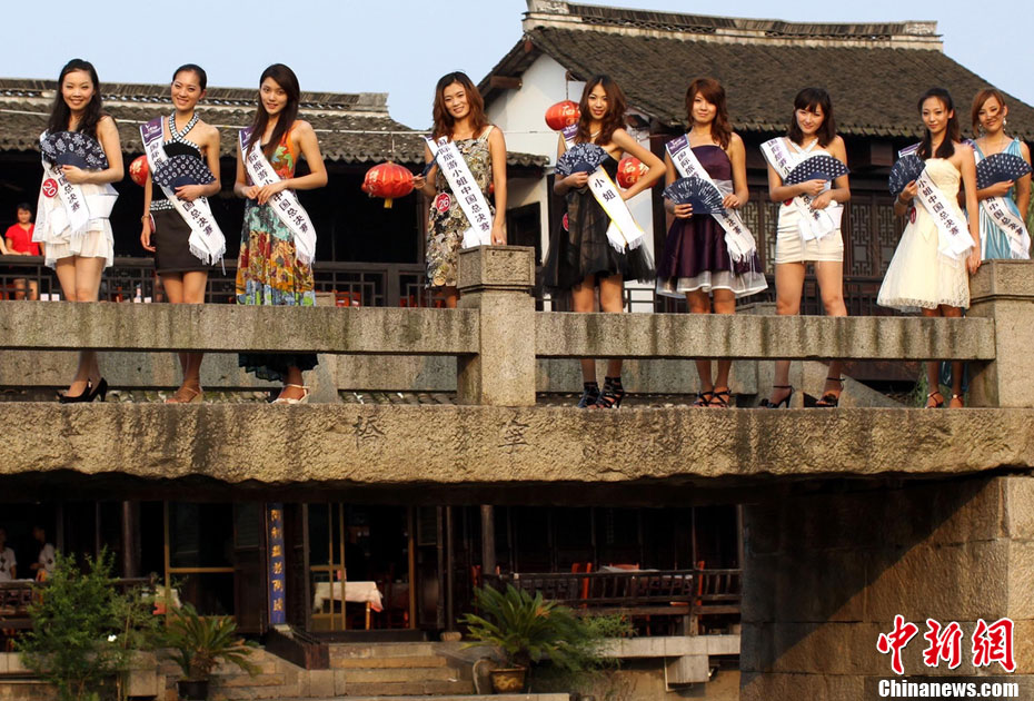 7月20日,正在浙江參加2010年國際旅游小姐中國區(qū)總決賽的34位佳麗來到西塘古鎮(zhèn)拍攝外景。此次賽事采取六輪淘汰賽形式進(jìn)行冠亞季選拔,并以欄目采取真人秀形式立體展示國旅及合作景區(qū)風(fēng)采。圖為參賽佳麗身著旗袍展示風(fēng)采。中新社發(fā) 錢興強(qiáng) 攝